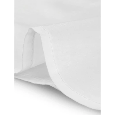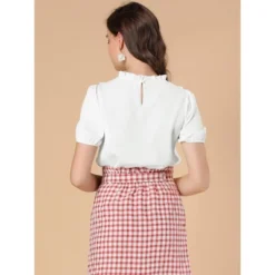 A solid color crochet lace blouse is ready for you to move in and out of the office. Simple and delicate, this blouse features a mock neck, short puff sleeves, and a button behind the neck. The model is wearing size XS (Height: 5’8″, Chest: 33 1/2 inches, Waist: 24 inches, Hip: 35 1/2 inches, Shoulder: 14 3/5 inches, Weight: 113.5 lbs).