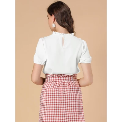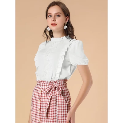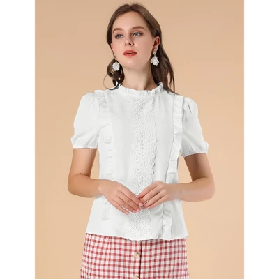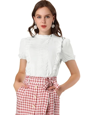 - Ruffle Trim, Short Sleeve, Crochet Lace Panel, Puff Shoulder, Elastic Cuffs, Button Keyhole Back, Mock Neck