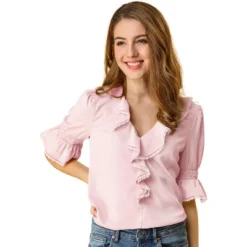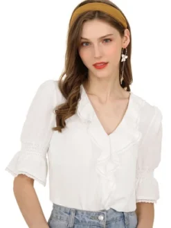 This pretty top shapes your graceful swingy silhouette with lively ruffled trims. This lightweight breezy chiffon top flatters at the front for easy, eye-catching appeal. A charming summery top with a half-length bell sleeve is sweet and smart, just like you. Billowed half sleeves accentuate the vintage feminine style blouse on sunny bright days. The lace ruffle details accentuate a retro-chic elegant top complete with flowy blouson sleeves.