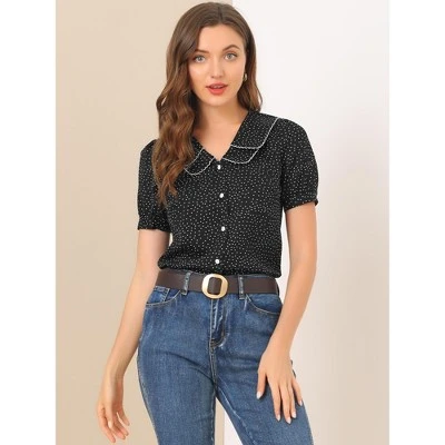 This vintage shirt with a Peter Pan collar and polka dot design adds to the beauty and charm of a woman. Polka dots and a Peter Pan collar bring casual romance to this puff-sleeve shirt. Suitable for daily casual, weekend gatherings, dating, office, and work. It is perfectly paired with jeans or skirts for a retro and chic look. A puff sleeve and embroidered decor add ebullient charm to this polka-dot top. Puff sleeves instantly elevate this retro shirt and make it a sophisticated choice for day or night. This vintage and sweet shirt, designed with a Peter Pan collar and puff short sleeves, adds a touch of cuteness to your wardrobe.