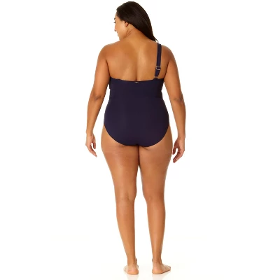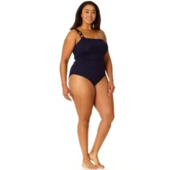 Our Plus Size Ring Strap Asymmetric One Piece Swimsuit is part of the Live In Color collection, which features a bold, solid color. This one piece swimsuit has an asymmetrical cut and removable cups for comfortable support and style for your summer. Pair this one piece swimsuit with our Button Down Shirt Swimsuit Cover Up for a breezy beach day look!