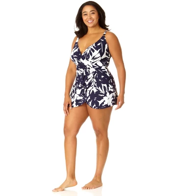 Our Plus Size Swim Dress With Skirted Bottom is part of the Coastal Palm collection, which features a navy and white tropical pattern. This one piece swim dress has adjustable shoulder straps and removable cups for comfortable support and style for your summer. Pair this swim dress with any Anne Cole Cover Up for a breezy beach day look!
