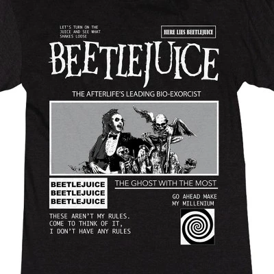 - CUSTOM DESIGN: A black and white image of Betelgeuse and a winged demon decorates the front of this graphic tee while white letters around the image repeated the character’s famous quotes. Beetlejuice fans will love this custom design.