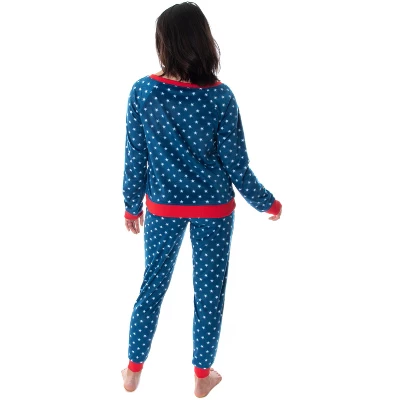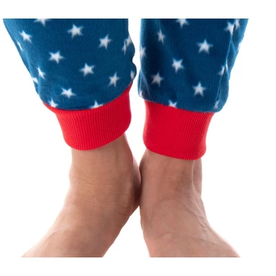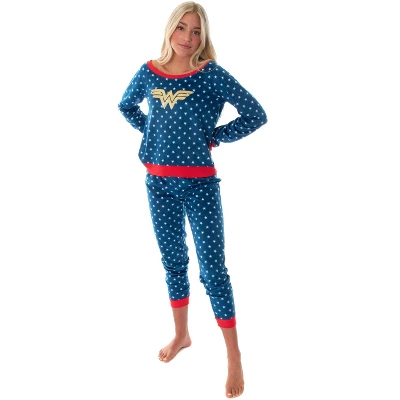 - WONDER WOMAN JOGGER PAJAMA SET – It has stretch cuffs at wrists, neckline, and waist. The pants also have stretch cuffs at ankles and waistband. The pajama pants have a drawstring closure. Both the shirt and the pants have an allover blue color with a white star pattern.