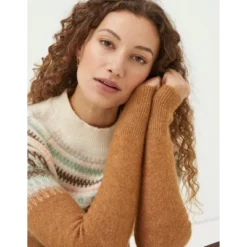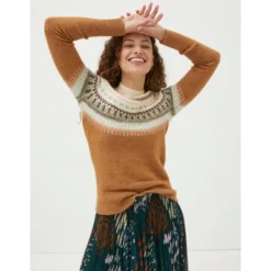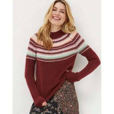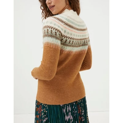 Add a pop of colour to grey days with our Bea yoke fairisle jumper. Made with a touch of wool, this jumper is hardwearing but soft on the skin and will last you season after season. The high neckline, lovely pattern and flattering fit make it a must have in your cold-weather wardrobe. From frosty morning dog walks to evenings out, its destined to become your go-to. Complete the look with your favourite pair of boots.
