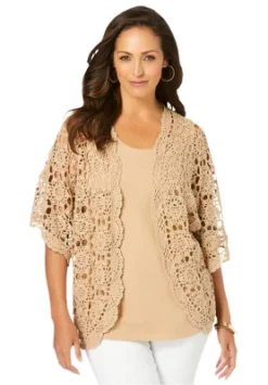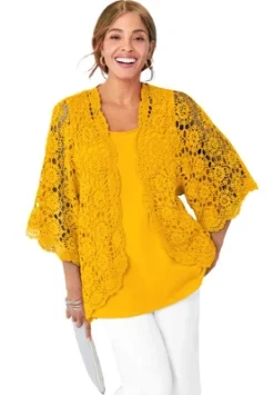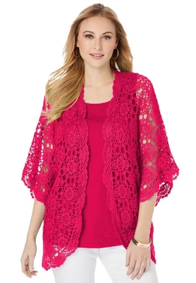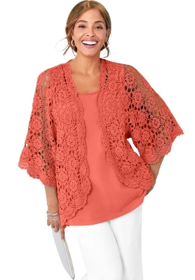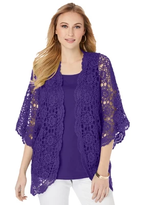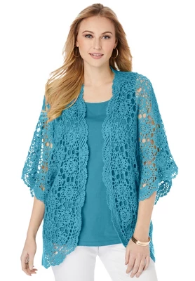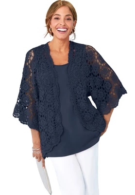 A favorite for easy layering, this crochet cardi is light, airy and ultra-chic. Open front, elbow length sleeves.
