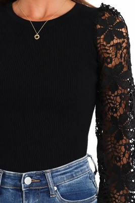 If lace is your thing, then this round neckline top is totally made for you! With long lace sleeves and a stretch ribbed knit body, it’s perfect for dressing up or down. Go from day to night in style with this must-have piece – you won’t be disappointed!