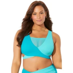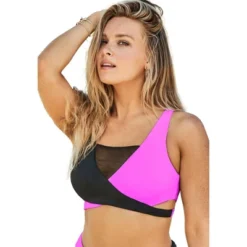 Look amazing in a bikini top that really brings the glamour! The color blocking not only adds a playful pop of color to your swim look, but also helps slim and shape you to flattering proportions. It’s styled with a wrap front that has mesh detail. Pair it with your favorite swim bottoms for your own unique look.