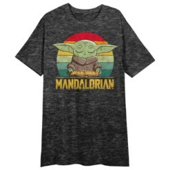 Celebrate your favorite sci-fi series in comfort with this Mandalorian night shirt. The shirt features an image of Grogu holding a book in a colorful circle while yellow letters below the image spell out the series title. The tee comes in a charcoal heather short sleeve crew neck. The Mandalorian fans will love this comfy night shirt.