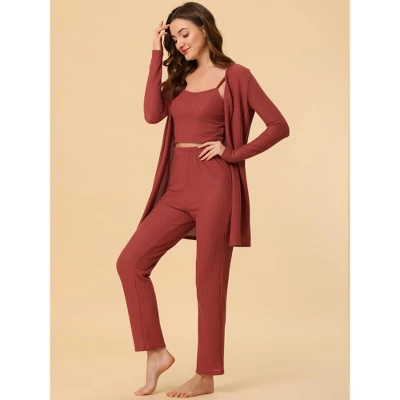 - Long sleeve cardigan, crop cami, knit fabric, elastic waist, 3-piece pajama set
