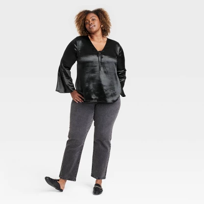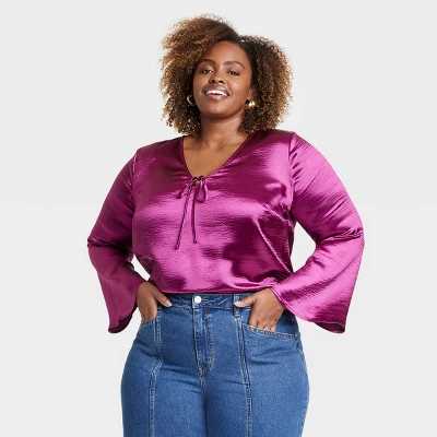 Add gorgeous style to your casualwear closet with this Flared Long-Sleeve Satin Blouse from Ava & Viv™. This flared long-sleeve blouse is framed by a V-neckline with a front tie detail for a flattering look. Made from shiny satin fabric in a standard fit, it offers comfortable all-day wear. Simply pair this flared long-sleeve blouse with your fave bottoms and footwear for versatile outfit options.