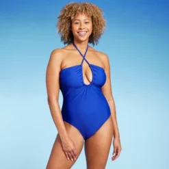 Spice up your swimwear with this Halter Keyhole Bandeau One-Piece Swimsuit from Shade & Shore™. Made from soft and stretchy fabric, this sleeveless swimsuit is designed in a keyhole bandeau silhouette with removable cups for customizable coverage and back strap fastenings for an adjustable fit. The slender, multiway halter straps with behind-the-neck ties elevate your summer sass and allow you to find a comfortable fit for confident wear in and out of the water. Complete your look with oversized sunnies and your fave flip-flops.