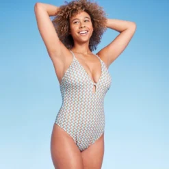 Keep your swim looks on-trend with this Deep V Center Front High-Leg Extra-Cheeky One-Piece Swimsuit from Shade & Shore™. This one-piece extra-cheeky swimsuit features a deep V-neck with a keyhole front, a modern geometric pattern, and a high-leg design. Made with a mix of soft and stretchy fabric, it lends flexible comfort both in and out of the water. The removable padded cups offer customizable coverage, while the crisscross back with a tie closure makes it easy to find just the right fit. Complete your look with a sarong or a cover-up and accessorize with a pair of sunglasses and flip-flops.