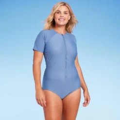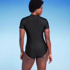 Add sporty appeal to your swimwear with this Short-Sleeve One-Piece Swimsuit with Front Zip from Kona Sol™. Fashioned in a solid color, this short-sleeve swimsuit features a rashguard style with a crewneck and a full-length zip front for easy wear. The stretchy fabric provides flexible comfort, and the sewn-in cups offer confident overage. Plus, the UPF 50+ rated material helps protect you from the sun’s rays whether in or out of the water.
