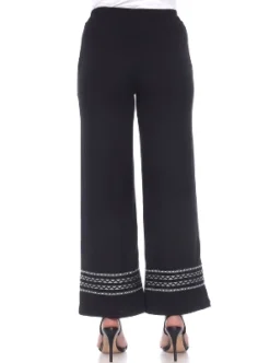 All day comfort for workwear or weekend adventures, flow freely in these simple but chic wide leg palazzo pants. Inspired by your favorite sweatpants, these trouser like bottoms features a mid rise elastic waistband, slit pocket at side, roomy wide leg, straight cut, and a simple yet elegant detail print at near bottom hem. Made with high quality polyester and spandex material with a gauzy sheer like finish for softness and durability. Comes in size small to extra large with an inseam of 28 inches.